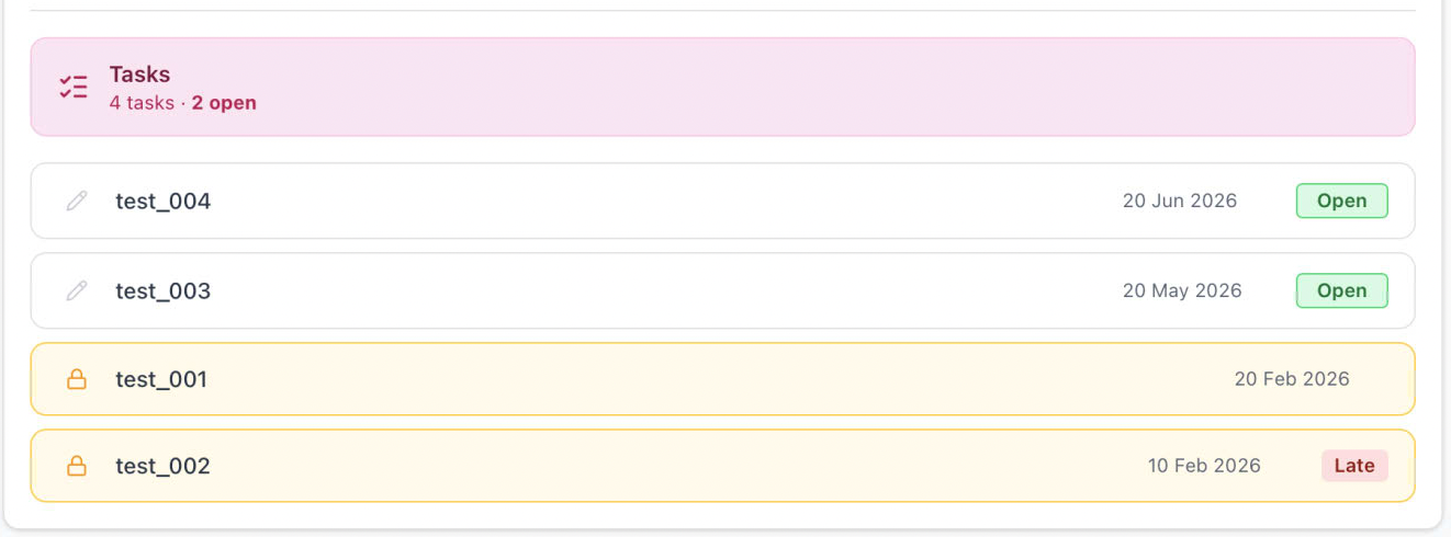 A list of Tasks is presented, with indicators for deadline date, late, and locked. If a user selects a task row, it replaces the placement list with the survey view in place — no page navigation, top navigation stays but back nav button changes label and action. If there is an stored data returned from the query initiated on clicking the row, client code always injects authoritative values for these fields, overriding anything in locally stored data.